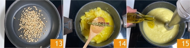 In der Zwischenzeit bringen Sie einen Topf mit gesalzenem Wasser zum Kochen, um die Pasta zu kochen, und rösten Sie die Pinienkerne in einer separaten Pfanne 13. Nachdem die Kartoffeln gekocht sind 14, entfernen Sie das Kräuterbündel und pürieren Sie die Mischung mit einem Stabmixer, während Sie die restlichen 25 g Öl in einem dünnen Strahl hinzufügen 15. Sie sollten eine homogene Creme erhalten.