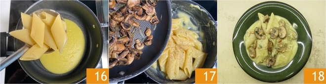 Kochen Sie die Pasta al dente und geben Sie die Hälfte der Kartoffelcreme in einen Topf. Lassen Sie die Pasta in den Topf abtropfen 16 und mischen Sie sie gut, fügen Sie eine Kelle des Kochwassers hinzu. Fügen Sie auch die Hälfte der Pilze hinzu 17, mischen Sie und pfeffern Sie. Jetzt sind Sie bereit zum Anrichten: Verteilen Sie einen Löffel Kartoffelcreme auf dem Boden, fügen Sie die gewürzte Pasta und einige der restlichen Pilze hinzu. Vervollständigen Sie mit den gerösteten Pinienkernen, etwas rohem Öl, Pfeffer und Kräutern nach Belieben. Ihre Pennoni mit Kartoffelcreme und Pilzen sind bereit zum Servieren 18!