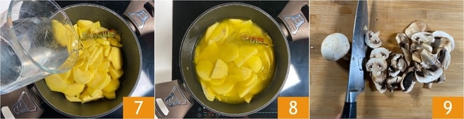 Gießen Sie Wasser in den Topf, bis die Kartoffeln gerade bedeckt sind 7, und kochen Sie sie 20-25 Minuten 8, wobei Sie bei Bedarf mehr Wasser hinzufügen. In der Zwischenzeit reinigen Sie die Pilze und schneiden Sie sie in ca. 6 mm dicke Scheiben 9. Schälen Sie die Schalotte und schneiden Sie sie der Länge nach in Scheiben.