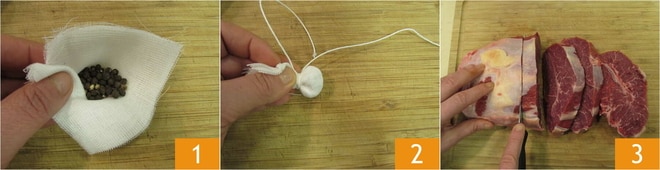Um den Peposo zuzubereiten, legen Sie zuerst die Pfefferkörner in eine Mullbinde 1 und machen Sie ein kleines Päckchen, indem Sie es mit einem Faden verschließen 2. Nun wenden Sie sich dem Fleisch zu, schneiden Sie es zunächst in etwa 3 cm dicke Scheiben 3