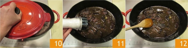 und mit einem Deckel abdecken 10. Lassen Sie es bei niedriger Hitze 2 Stunden kochen. Dann den Deckel abnehmen, mit Salz abschmecken 11, umrühren 12 und weitere zwei Stunden bei niedriger Hitze kochen lassen, gelegentlich umrühren.