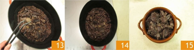 Wenn die Sauce eingedickt ist, entfernen Sie das Päckchen mit dem Pfeffer 13. Ihr Peposo ist bereit 14, probieren Sie das Fleisch, um den Gargrad zu überprüfen, und wenn nötig, mit Salz abschmecken und servieren 15.