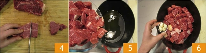 und dann in 4 cm lange Streifen 4. Entfernen Sie nicht das Fett vom Fleisch, es sei denn, es ist zu viel. Stellen Sie einen Topf, vorzugsweise aus Gusseisen, auf den Herd, geben Sie das Fleisch hinzu 5, die geschälten Knoblauchzehen 6