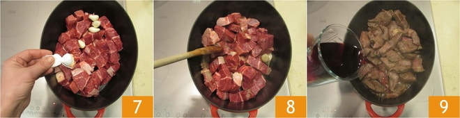 und das Päckchen mit dem Pfeffer 7. Rühren Sie um 8 und braten Sie das Fleisch mindestens 10 Minuten lang an. An diesem Punkt den Rotwein hinzufügen 9