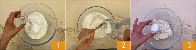 Um die Pizza mit Trüffelcreme und Schinken vorzubereiten, beginnen Sie mit dem Teig. In einer großen Schüssel vereinen Sie die frische Bierhefe mit dem Mehl 1. Geben Sie nach und nach das Wasser hinzu 2 und fügen Sie an dieser Stelle das Salz hinzu 3.