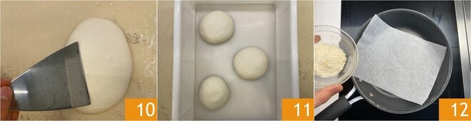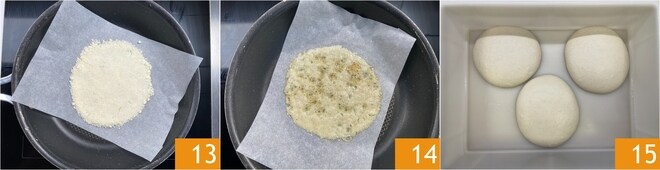 Nach dieser Zeit, teilen Sie mit Hilfe eines Teigschabers den Teig in 6 Stücke von jeweils etwa 260 g 10. Lassen Sie die Teiglinge bei einer Temperatur zwischen 18° und 24°C für 8/12 Stunden in einer Teigbox gehen 11. In der Zwischenzeit können Sie die Grana Padano Waffeln vorbereiten. Legen Sie Backpapier in eine Pfanne und geben Sie den Grana in die Mitte 12.