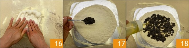 Nehmen Sie jedes Teigstück vorsichtig und rollen Sie es mit einer Prise Mehl aus 16. Auf der Pizzaschaufel das Teigstück ausbreiten und mit der Trüffelcreme 17 und einem Schuss natives Olivenöl extra 18 würzen.