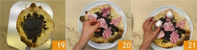 Backen Sie die Pizza im vorgeheizten Ofen bei 250° (oder bei der höchstmöglichen Temperatur) für etwa 5-7 Minuten im statischen Modus 19. Nehmen Sie sie aus dem Ofen und fügen Sie die Scheiben Schinken 20 und die Büffelmozzarella-Bällchen 21 hinzu.