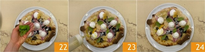 Schließlich fügen Sie den frischen Basilikum und die von Hand gebrochenen Grana Waffeln hinzu 22, einen letzten Schuss natives Olivenöl extra 23, eine Prise schwarzen Pfeffer, und Ihre Pizza mit Trüffelcreme und Schinken ist fertig 24!