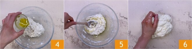 Geben Sie auch das natives Olivenöl extra hinzu 4 und den Zucker, dann rühren Sie zuerst mit einem Löffel 5, danach beginnen Sie mit den Händen zu kneten 6.