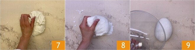Anfangs wird der Teig rustikal und klebrig sein 7, aber nachdem Sie ihn auf der Arbeitsfläche bearbeitet haben, wird er immer glatter und homogener 8. Sobald der Teig glatt ist, lassen Sie ihn etwa 30 Minuten unter einer Schüssel oder einem Tuch ruhen 9.