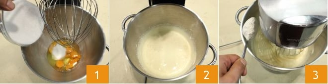 Um den zweifarbigen Pistazien-Orangen-Kuchen zuzubereiten, bestäuben Sie die Tropfen und legen Sie sie für etwa 2 Stunden in den Gefrierschrank. In einer Rührmaschine mit Schneebesen geben Sie die Eier und den Zucker 1, schalten Sie die Maschine an und schlagen Sie, bis Sie eine schaumige und helle Masse erhalten 2. Fügen Sie das gesiebte Mehl und Backpulver löffelweise hinzu 3,
