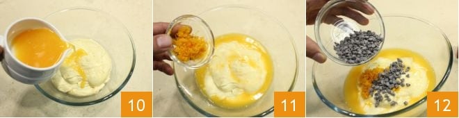 In die andere Schüssel mit dem Teig fügen Sie den Orangensaft 10, die geriebene Schale 11 und die Schokoladentropfen 12 hinzu