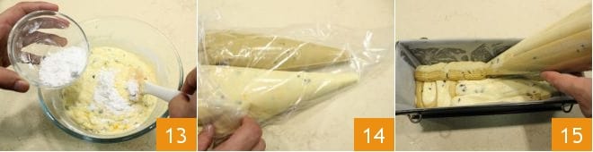 und die Kartoffelstärke 13. Rühren Sie vorsichtig und geben Sie dann die beiden Massen in zwei Spritzbeutel ohne Tülle und legen Sie die beiden Spritzbeutel in einen größeren, der sie aufnehmen kann 14, fetten und legen Sie eine 28 x 11 cm Kuchenform mit Backpapier aus, füllen Sie die Form, indem Sie die beiden Massen aus den Spritzbeuteln drücken, so erhalten Sie einen zweifarbigen Teig 15.