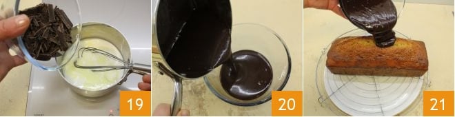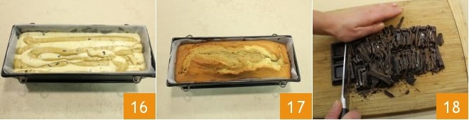 Wenn Sie das Ausdrücken der beiden Massen beendet haben 16, backen Sie den Kuchen im vorgeheizten statischen Ofen bei 170°C für 60 Minuten (oder in einem Umluftofen bei 150°C für 50 Minuten). Sobald er gebacken ist, nehmen Sie ihn aus dem Ofen 17 und lassen ihn leicht abkühlen, dann stürzen Sie ihn auf ein Gitter und lassen ihn vollständig abkühlen. Bereiten Sie die Ganache vor: Hacken Sie die dunkle Schokolade 18