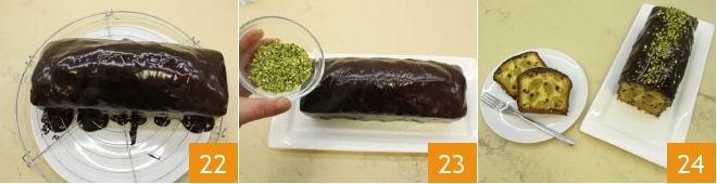 Wenn der ganze Kuchen mit der Ganache bedeckt ist 22, übertragen Sie den Kuchen auf eine Servierplatte und dekorieren die Oberfläche mit gehackten Pistazien 23. Der zweifarbige Pistazien-Orangen-Kuchen ist bereit zum Genießen 24.