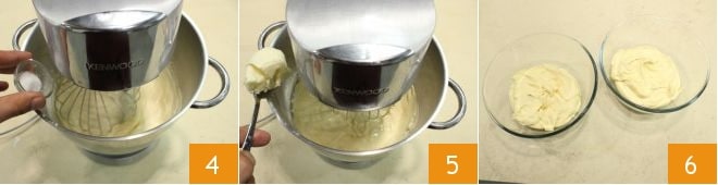 das Salz 4 und zum Schluss die weiche Butter, Stück für Stück 5, und warten Sie, bis das vorherige Stück aufgenommen wurde, bevor Sie ein weiteres hinzufügen. Wenn der Teig homogen und glatt ist, schalten Sie die Rührmaschine aus. Teilen Sie die Masse in zwei Schüsseln 6 (jeweils etwa 400 g)