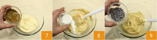 In eine Schüssel fügen Sie die Pistazienpaste 7, die Milch 8 und 50 g Schokoladentropfen 9 hinzu, verrühren Sie vorsichtig mit einem Spatel, um die Masse zu vermischen