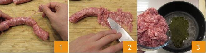 Um die Polenta mit Wurst und Käse zuzubereiten, kümmern Sie sich zuerst um das Ragout: Entfernen Sie die Haut von der Wurst 1, dann zerkleinern Sie das Fleisch mit einem Messer 2. Erhitzen Sie einen Schuss Olivenöl in einem hochrandigen Topf, geben Sie die Wurst hinein 3,