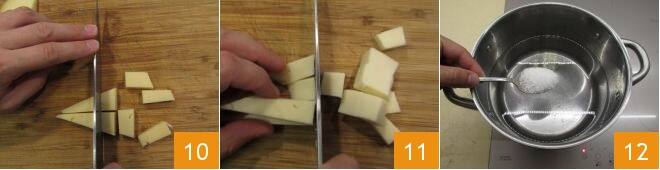 Kümmern Sie sich jetzt um die Polenta: Schneiden Sie den Fontina 10 und den Toma 11 in Würfel. Setzen Sie einen Topf mit dickem Boden auf den Herd, geben Sie Wasser hinein und salzen Sie, sobald es zu kochen beginnt 12