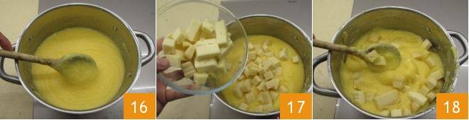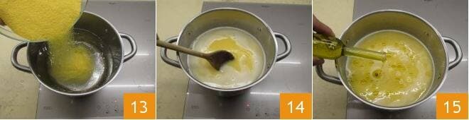 und geben Sie dann den Maisgrieß hinzu 13. Halten Sie die Hitze hoch und rühren Sie schnell um 14. Geben Sie auch das Olivenöl hinzu, damit keine Klumpen entstehen 15, und kochen Sie weitere 50 Minuten bei schwacher Hitze unter ständigem Rühren, um zu verhindern, dass die Polenta am Boden klebt.
