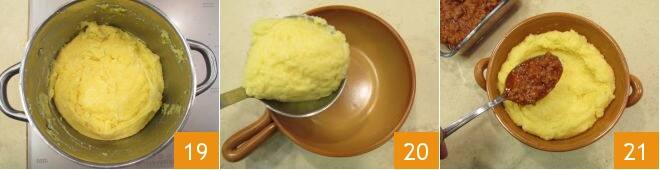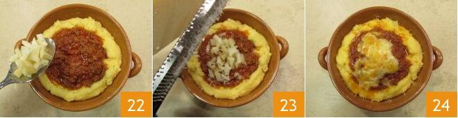 Die Polenta ist fertig 19: Nehmen Sie 4 feuerfeste Keramikschalen, wenn Sie Einzelportionen zubereiten möchten, oder verwenden Sie eine große Auflaufform, geben Sie eine großzügige Kelle Polenta hinein 20, würzen Sie mit ein paar Esslöffeln Ragout 21,