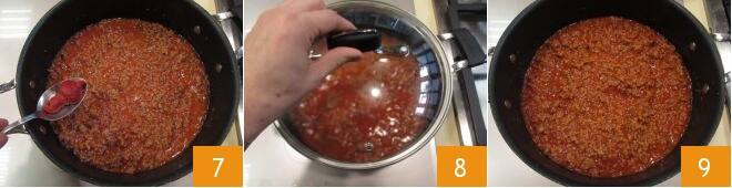und das Tomatenmark 7. Rühren Sie mit einem Löffel um, decken Sie mit einem Deckel ab 8 und kochen Sie es 15 Minuten oder so lange, bis die Sauce eingedickt ist; sobald es fertig ist, halten Sie es warm beiseite 9.