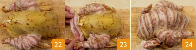 Vervollständigen Sie es nun mit dem Guanciale: Beginnen Sie mit dem Umwickeln der Keulen 22 und fahren Sie mit dem Körper fort, indem Sie die Scheiben ordentlich und leicht überlappend verteilen 23. Wenn das Huhn vollständig umwickelt ist 24, legen Sie es in eine Auflaufform.