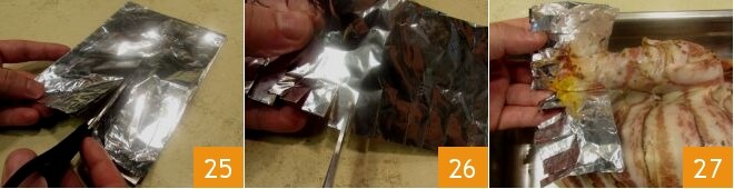Sie können das Ende der Keulen auf klassische Weise abdecken: Falten Sie zwei Alufolien übereinander, bis sie zu zwei Rechtecken von 6-8 cm reduziert sind 25, und schneiden Sie sie entlang der langen Seite in 2-3 cm dicke Streifen 26. Wickeln Sie das Ende der Keulen mit den Streifen nach außen ein 27.