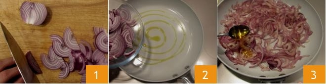 Um das gefüllte Huhn im Ofen zuzubereiten, kümmern Sie sich zunächst um die Füllung. Karamellisieren Sie zuerst die Zwiebeln: Schälen und schneiden Sie sie in ziemlich dünne Scheiben 1, geben Sie sie in eine mit Öl beträufelte Antihaftpfanne 2 und fügen Sie schließlich den Honig und den braunen Zucker hinzu 3.