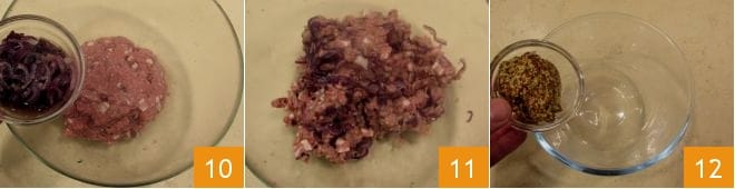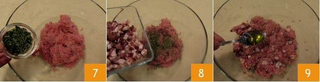 fügen Sie sie dem Kalbshackfleisch hinzu 7 zusammen mit den gewürfelten Speckstückchen 8 und nach Zugabe des Öls 9 mischen Sie alles perfekt und schmecken es mit Salz und Pfeffer ab.