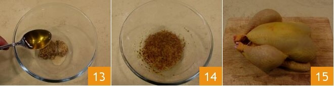 Bestreichen Sie das Innere des Huhns gut mit einem Großteil der Senf-Honig-Soße 16 und nähen Sie den Rücken mit Nadel und Küchengarn zu, um zu verhindern, dass die Füllung herausläuft 17. Füllen Sie das Huhn mit einem Löffel und drücken Sie die Füllung gut an 18.
