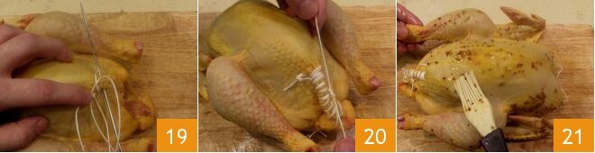 Nähen Sie auch das andere Ende zu 19 und verknoten Sie die Naht fest 20. Bestreichen Sie die gesamte Oberfläche des Huhns, einschließlich der Keulen, mit der restlichen Soße 21.