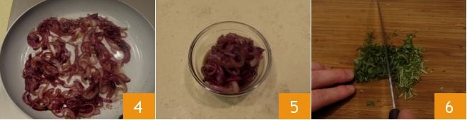 Kochen Sie die Zwiebeln 7-8 Minuten bei schwacher Hitze und rühren Sie gelegentlich um, bis sie weich und karamellisiert sind. Wenn sie fertig sind 4, geben Sie sie in eine Schüssel und lassen Sie sie vollständig abkühlen 5. Fahren Sie mit der Füllung fort: Hacken Sie die Kräuter fein 6,