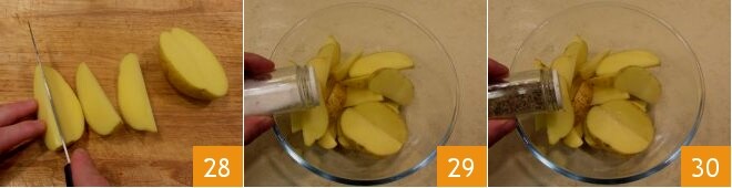 Jetzt können Sie sich der Beilage widmen. Waschen und trocknen Sie die Kartoffeln, ohne die Schale zu entfernen, und schneiden Sie sie in Spalten 28. Geben Sie in eine Schüssel Kartoffeln, Salz 29 und Pfeffer 30.