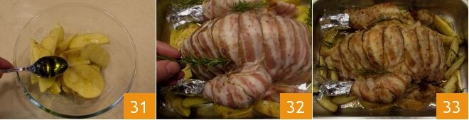 Fügen Sie schließlich das Öl hinzu 31 und mischen Sie sie, um die Aromen zu kombinieren. Würzen Sie das Huhn und die Kartoffeln mit dem gehackten Rosmarin und mit ganzen Zweigen 32. Decken Sie schließlich die Auflaufform mit einem Blatt Alufolie ab und backen Sie sie im vorgeheizten statischen Ofen bei 180° für mindestens 110 Minuten (bei Umluft bei 160° für 100 Minuten). Wenn Sie nach der angegebenen Zeit feststellen, dass das Hühnerfleisch noch am Knochen haftet oder zu rosa ist, setzen Sie das Garen fort, auch indem Sie die Temperatur leicht erhöhen, wenn nötig. Ihr gefülltes Huhn ist fertig 33: Servieren Sie es heiß.