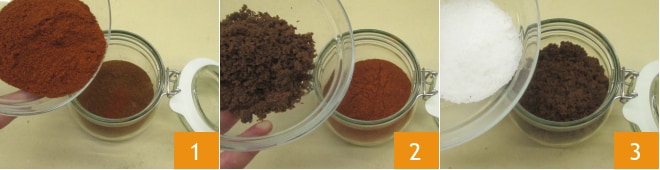 Um das Pulled Pork zuzubereiten, bereiten Sie zuerst den Rub zu: Nehmen Sie ein großes Glas und geben Sie das Paprikapulver, sowohl süß als auch geräuchert 1, den Muscovado-Zucker 2 und das feine Salz 3 hinein.
