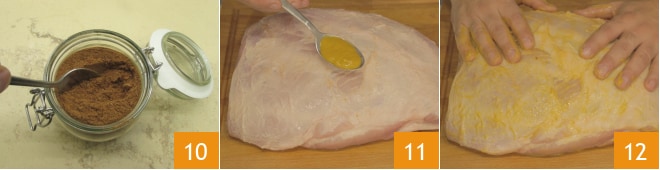 Mischen Sie alle Gewürze gut, um eine homogene Mischung zu erhalten 10; wenn nötig, können Sie sie auch sieben. Nehmen Sie jetzt die Schweineschulter, geben Sie den Senf 11 dazu und verteilen Sie ihn mit den Händen gleichmäßig auf der gesamten Oberfläche, sowohl oben als auch unten, um eine dünne Schicht zu erzeugen 12.