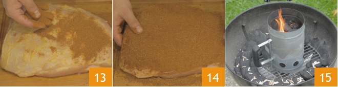 Dann bestreuen Sie das Fleisch mit dem Rub 13, und achten Sie darauf, es vollständig zu bedecken 14. In der Zwischenzeit zünden Sie den Grill an und stellen ihn für indirektes Garen ein 15.