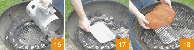 Verteilen Sie die Holzkohle auf einer Seite des Grills 16 und legen Sie auf die andere Seite eine Aluminiumschale, die die Fleischsäfte auffangen soll 17, dann legen Sie die Schweineschulter auf den Rost in den Bereich ohne direkte Hitze 18.