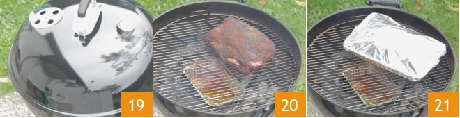Stellen Sie die Luftöffnungen so ein, dass die Kammertemperatur bei etwa 150°C bleibt und beginnen Sie mit dem Räuchern 19. Garen Sie mit geschlossenem Deckel mindestens ein paar Stunden, bis der Rub eine Kruste bildet, den sogenannten Bark 20. An diesem Punkt legen Sie das Fleisch in eine Aluminiumschale und wickeln das Ganze in Folie ein. Legen Sie die Schale auf den Grill 21 und setzen Sie das Garen für weitere 6-8 Stunden fort, wobei Sie darauf achten, dass die Kammertemperatur bei 130°C-150°C bleibt. Sie können überprüfen, ob das Fleisch gar ist, indem Sie die Kerntemperatur messen, die 97°C-98°C erreichen sollte.