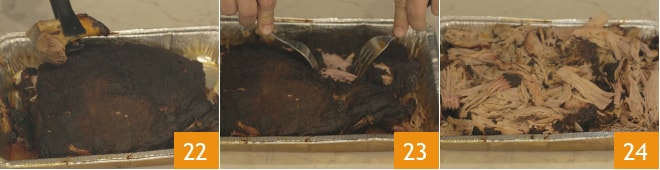 Nach der Garzeit gießen Sie die entstehende Garflüssigkeit aus der Schale ab und entfernen Sie die Knochen mit einer Küchenzange 22, dann zupfen Sie das Fleisch einfach mit zwei Gabeln 23, wobei Sie auch einige ganze Stücke lassen 24.