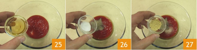 Bereiten Sie die Sauce zu: Geben Sie den Ketchup in eine Schüssel zusammen mit dem Apfelessig 25, Pfeffer, Salz 26 und Ingwerpulver 27.