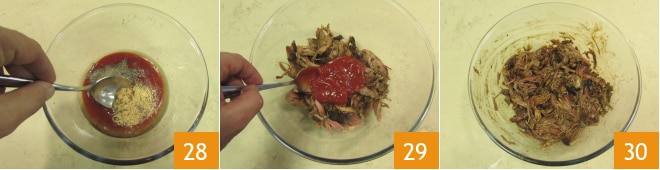 Mischen Sie gut 28 und fügen Sie die gewonnene Sauce zum gezupften Fleisch hinzu 29. Mischen Sie, um das Gewürz gleichmäßig zu verteilen 30.