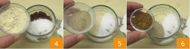 Fügen Sie außerdem noch das Knoblauchpulver 4, den weißen Pfeffer 5 und das Korianderpulver 6 hinzu.