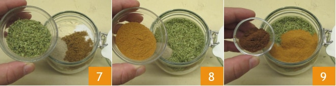 Zum Schluss geben Sie den getrockneten Oregano 7, den Cayennepfeffer 8 und das Anispulver 9 hinzu.