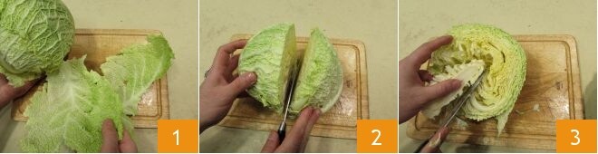 Um Reis und Wirsing zuzubereiten, beginnen Sie mit der Herstellung der Gemüsebrühe. Sobald diese bereit ist, waschen und trocknen Sie den Wirsing gründlich. Entfernen Sie die äußeren Blätter 1, halbieren Sie den Wirsing 2 und entfernen Sie den harten Mittelstrunk, indem Sie mit einem kleinen, aber scharfen Messer einen dreieckigen Schnitt um den zu entfernenden Teil machen 3.