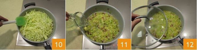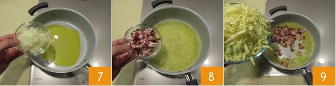 In einem Topf mit antihaftbeschichtetem Boden und hohem Rand die Zwiebel bei niedriger Hitze im Öl anbraten 7, gelegentlich umrühren. Wenn sie goldgelb ist, den Speck hinzufügen 8: Lassen Sie ihn einige Minuten anbraten, bis er eine leichte Kruste auf der Oberfläche bildet. Weiter umrühren, um zu verhindern, dass Speck und Zwiebel am Topfboden haften bleiben. Fügen Sie nun den Wirsing hinzu 9.