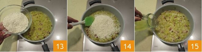 Fügen Sie nun den Reis hinzu 13, mischen Sie die Zutaten gut 14 und geben Sie die restliche Brühe dazu 15. Lassen Sie bei mittlerer Hitze kochen, bis eine dicke und fast trockene Suppe entsteht.