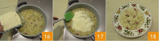 Einige Minuten vor Ende der Garzeit fügen Sie den geriebenen Käse hinzu 16, mischen Sie gut durch 17. Zum Schluss mit Salz und Pfeffer abschmecken und den Reis und Wirsing anrichten 18!